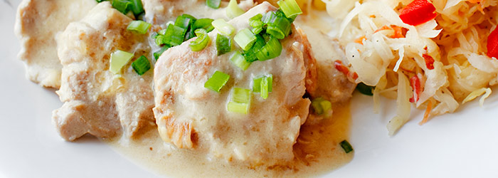 Polędwicę opłukać i osuszyć, odciąć białą błonę na boku. Mięso pokroić na 1 cm plasterki. Rozgrzać dużą patelnię z pokrywą lub rondel z grubym dnem. Wlać olej i gdy będzie już gorący układać plasterki mięsa i smażyć przez ok. 2 - 3 minuty na złoty kolor. W międzyczasie doprawić solą morską (niezbyt dużo, bo sos sojowy jest słony) oraz pieprzem. Przewrócić na drugą stronę i powtórzyć smażenie. Wlać wino i gotować przez pół minuty, następnie wlać gorącą wodę i dodać sos sojowy, przykryć i zagotować. Gotować pod przykryciem przez ok. 25 minut, do miękkości mięsa, w międzyczasie 1 - 2 razy mięso przewrócić. Pod koniec dodać chrzan. Dodać śmietankę oraz (bezpośrednio przez sitko) mąką ziemniaczaną, wymieszać i zagotować. Odstawić z ognia i podawać z posiekanym szczypiorkiem.
