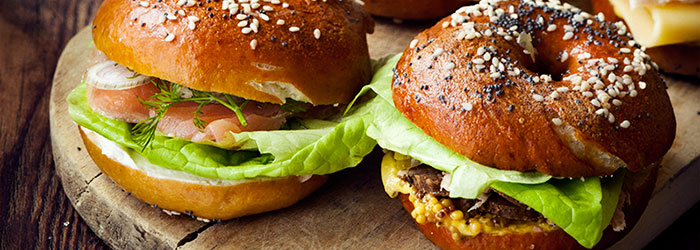Roztwór: w głębokim garnku zagotować wodę. Zmniejszyć ogień, dodać miód, sodę i sól, wymieszać do rozpuszczenia. Wkładać po 3 - 4 bajgle i gotować po minucie z każdej strony. Odkładać na blachę do pieczenia wyłożoną papierem i od razu posypać makiem, sezamem. Wstawić do piekarnika nagrzanego do 200 stopni C i piec przez ok. 20 minut lub na złoty kolor. Można po przekrojeniu grillować w tosterze lub opiekaczu.