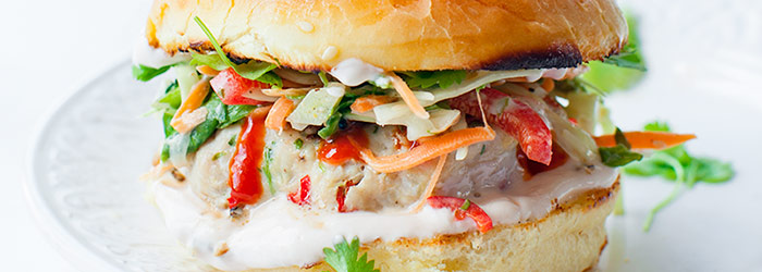 Propozycja podania Bułkę do hamburgerów (przepis) przekroić na pół i lekko zgrillować. Połówki bułki smarować mieszanką majonezu i srirachy (ostrego sosu chili) lub pikantnego ketchupu. Na dolnej połówce bułki położyć burgera, przykryć surówką colesław, posypać kolendrą, przykryć drugą połówką bułki i podawać.
